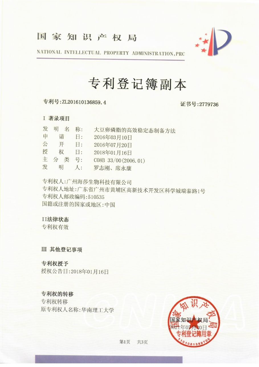 • 廣州海莎生物科技有限公司獲磷脂生產(chǎn)新專利,為開發(fā)高質(zhì)量磷脂 產(chǎn)品提供了保障。